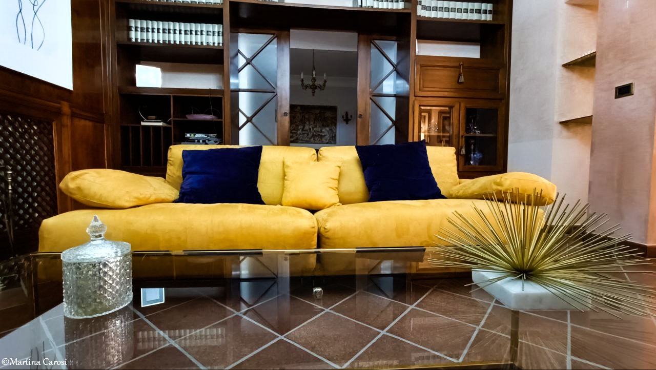 Ampio soggiorno con divano, cucina abitabile fornita di tutti gli accessori e divano.